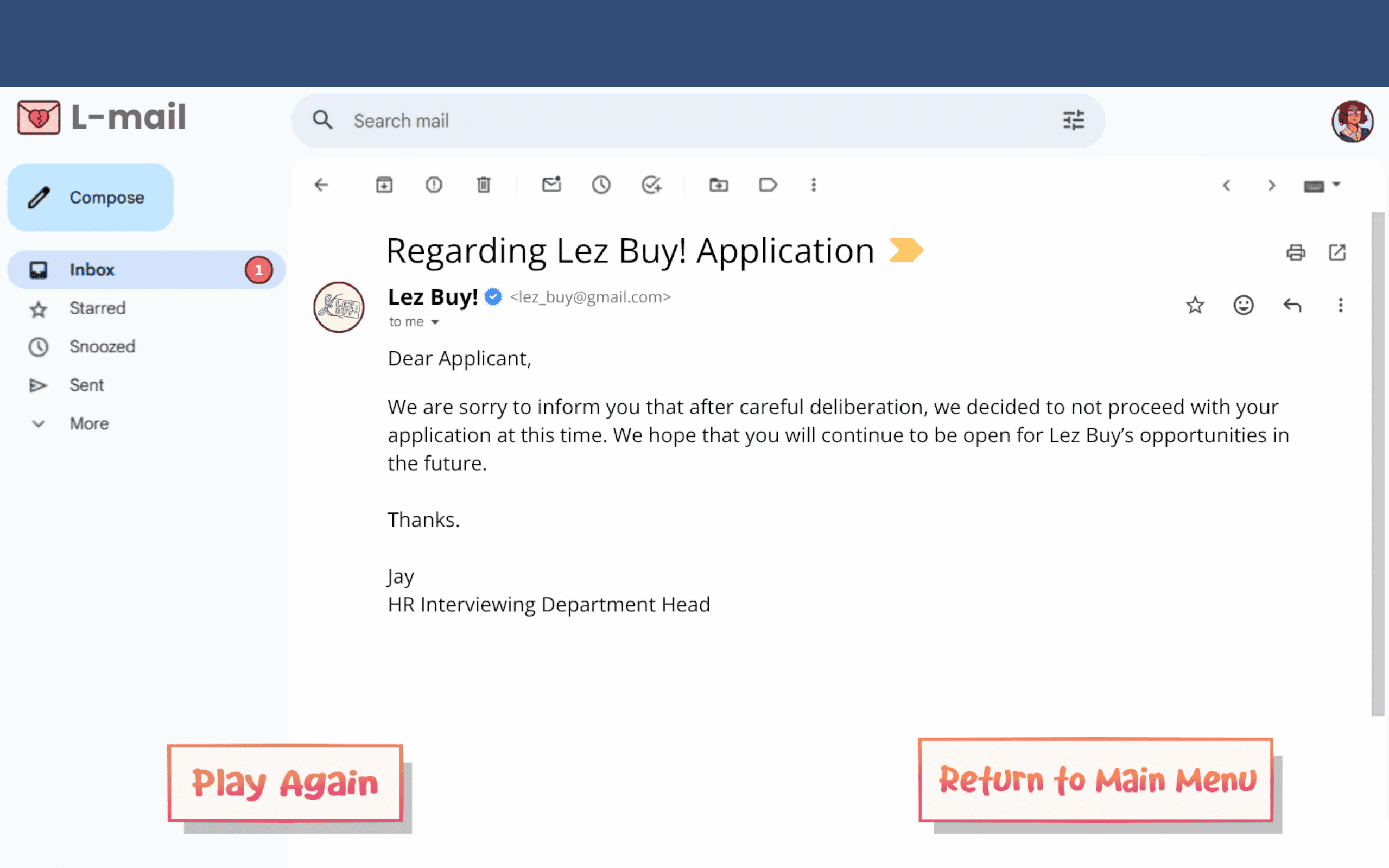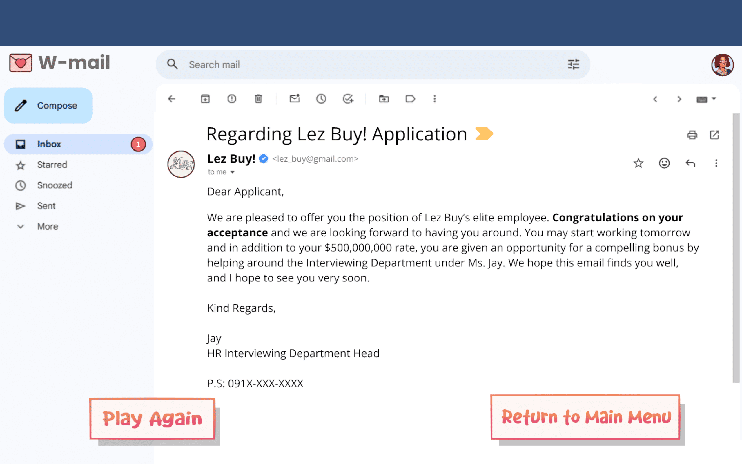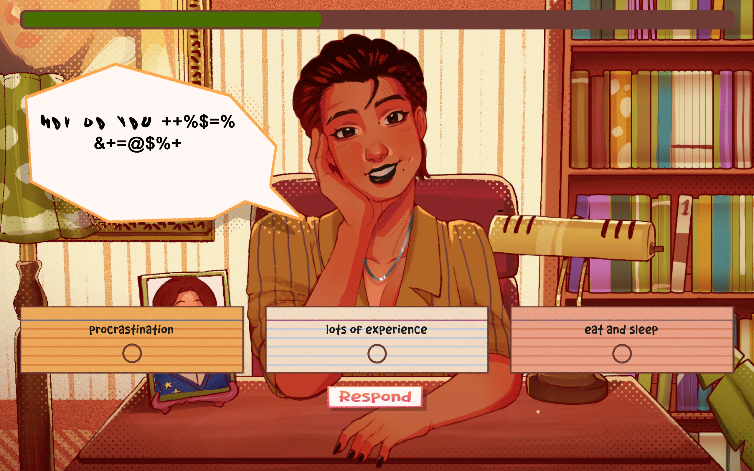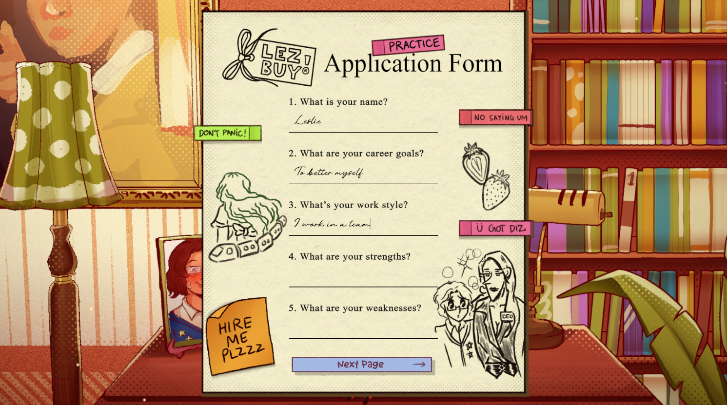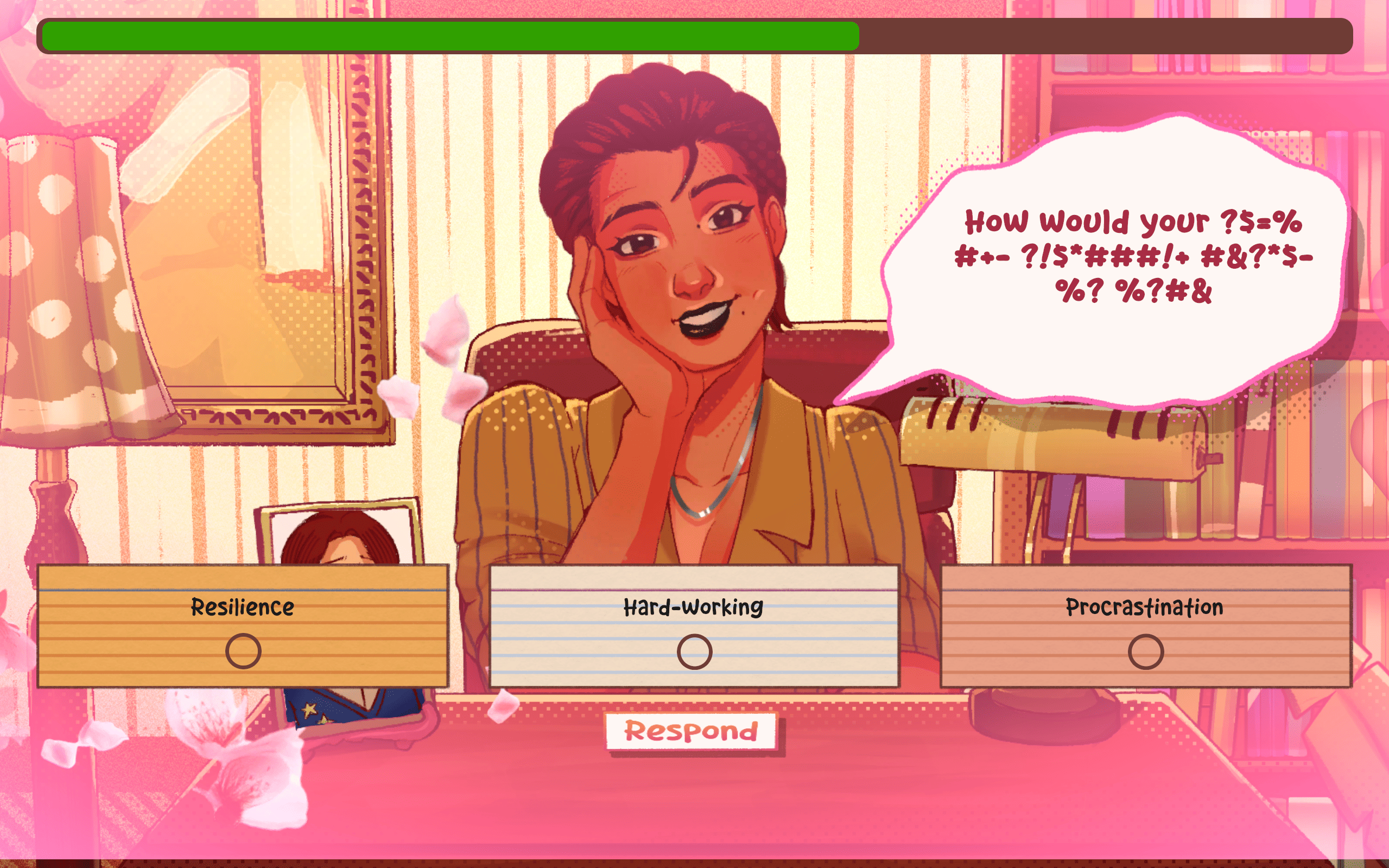 Mad-libs type game where you play as a woman seeking for a job but you're getting interviewed by someone you're (clearly) attracted to. The problem? You can't hear anything she's saying, so you have to fake your answers until you make it.